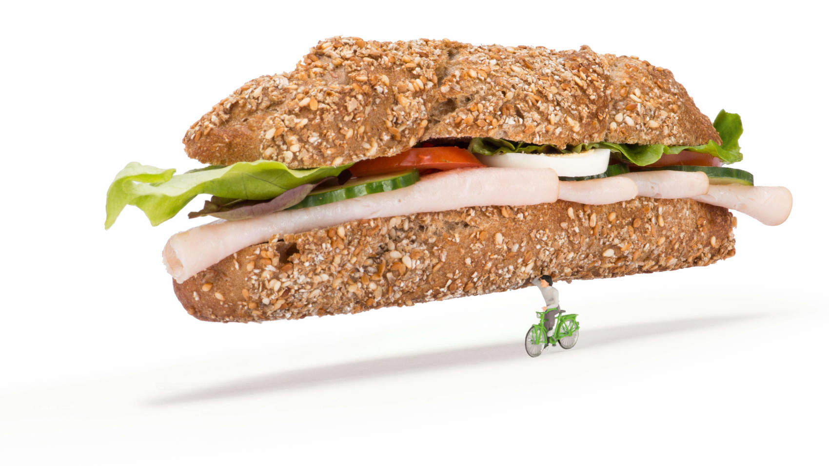 Der Velokurier liefert vieles aus unserem Sortiment: Das Takeaway-Tagesmenü (exkl. Suppe), Sandwiches, Belegte Brote, Salate, Müsli sogar Getränke.